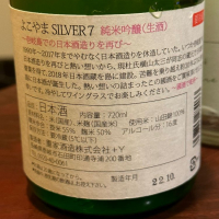 よこやま 純米吟醸 SILVER 7 生酒 精米歩合: 麹米:50%/掛米:55% アルコール度:16度 爽やかな酸味にフルーティな甘味。 グレープフルーのような穏やかな苦味に 上品な甘味がマッチしています。 ワイングラスがピッタリな とても美味しいお酒でした。