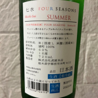 七水 FOUR SEASONS SUMMER 甘味は強い方かもしれませんが、酸味が効いていて、若干の辛味でスッとキレます。等外米(雄町)らしいのですが、酒質が綺麗で嫌味がなく、甘酸辛のバランスも素晴らしいです。等外米のせいか値段も安く税込1,650円です。初日は5.0だと思いました。日が経つと少し辛さが出てくる気がしたので、フレッシュなうちに冷やして飲むのが良いのかもしれません。いやー美味しかった。七水、良いですね。